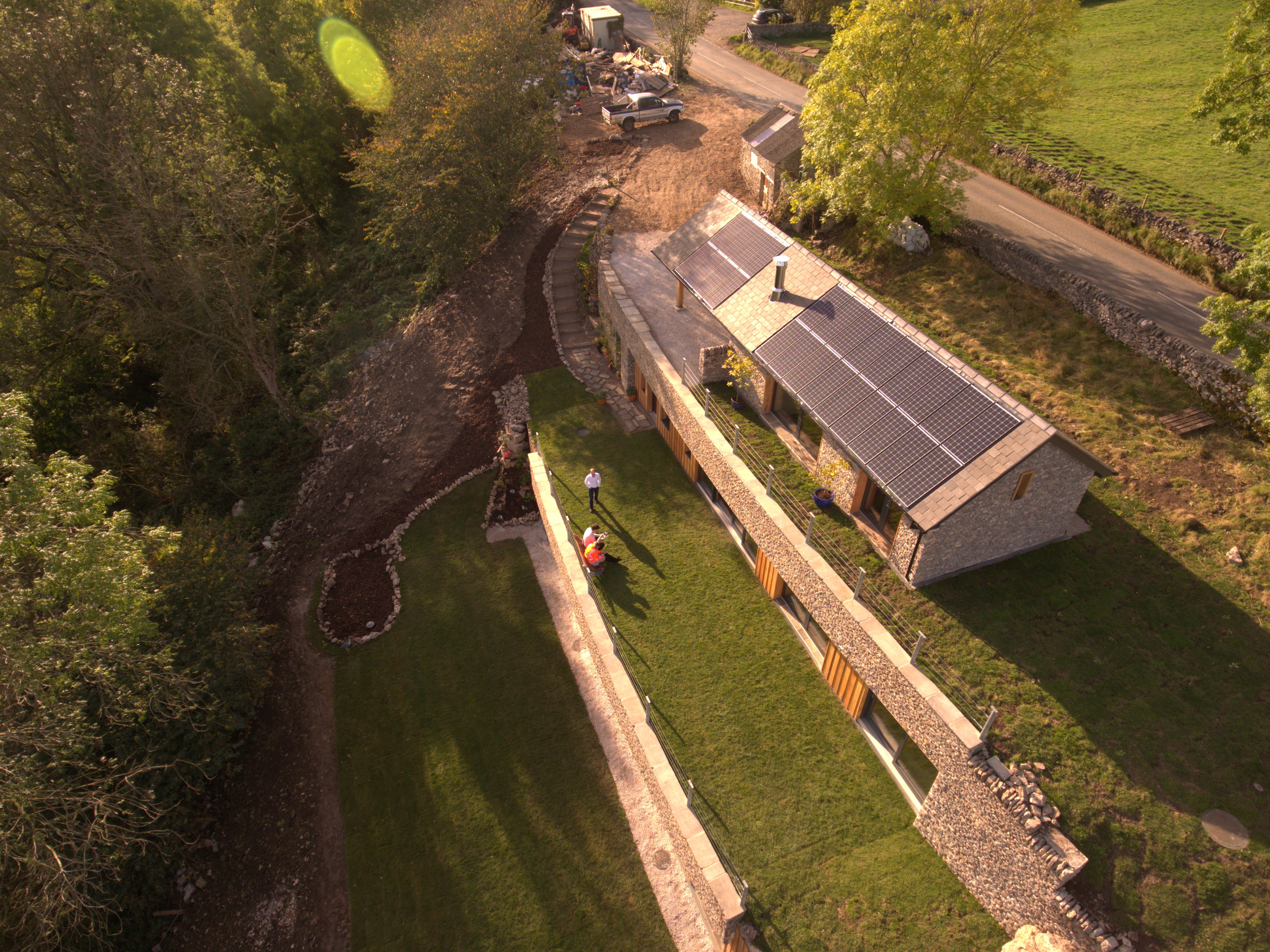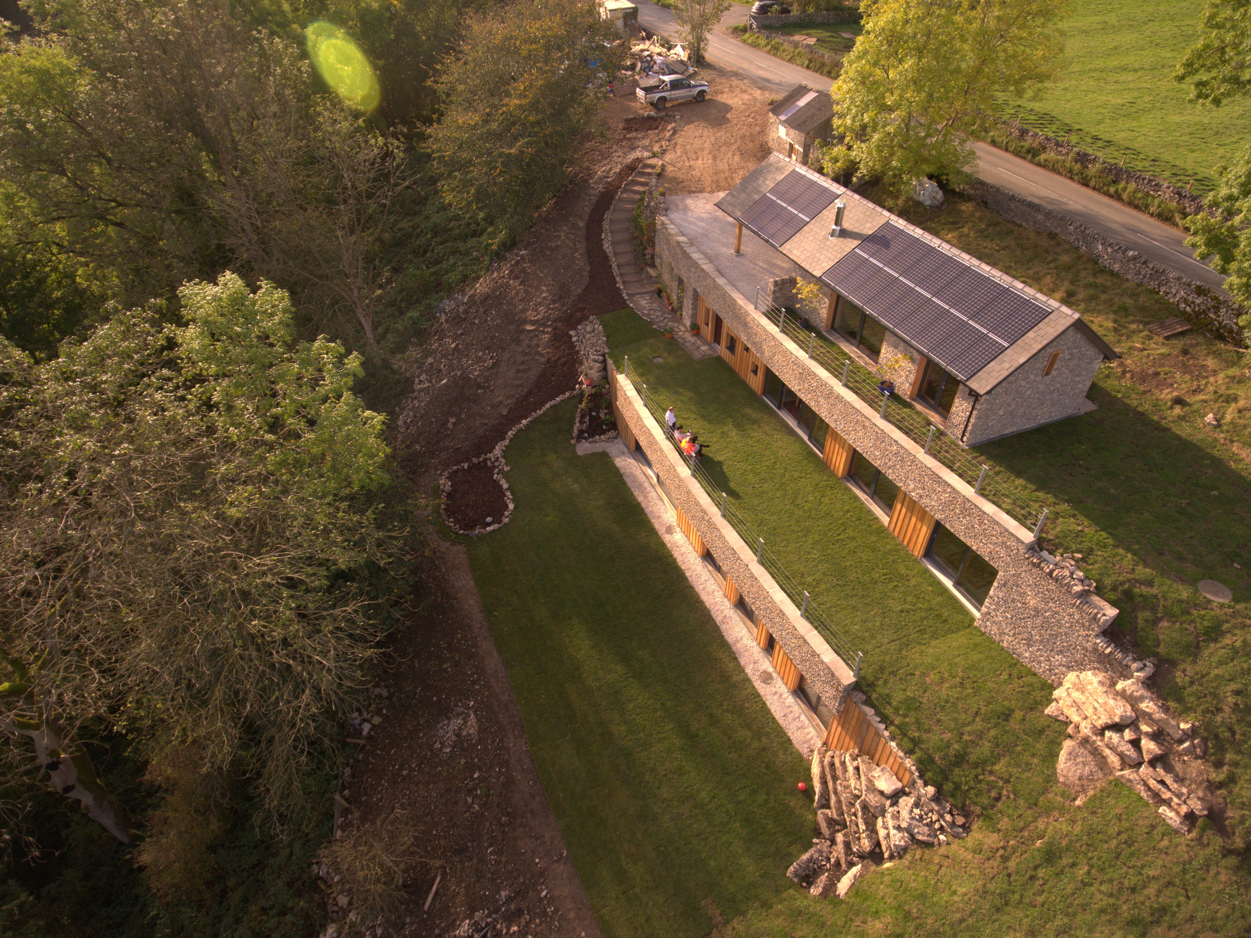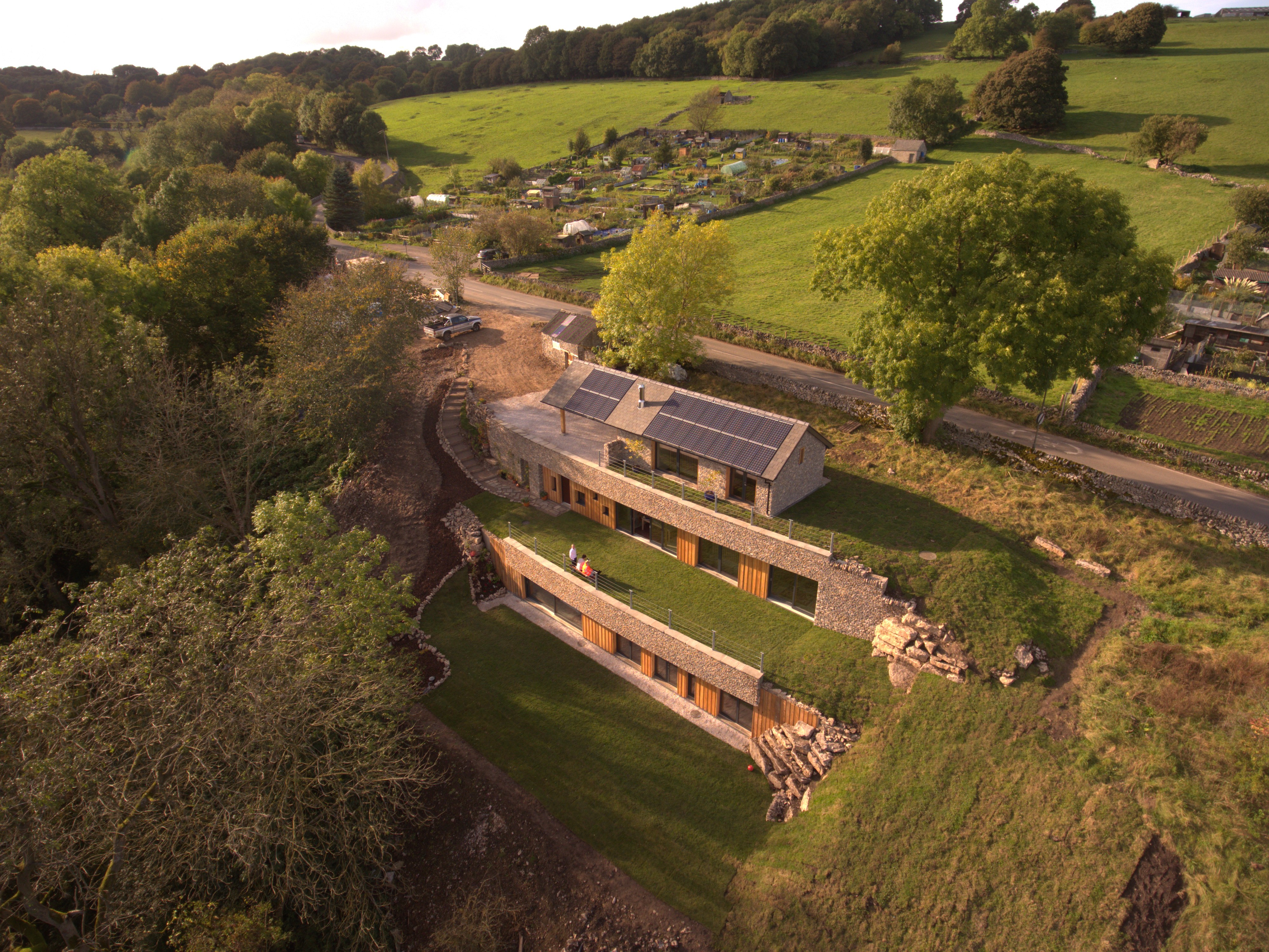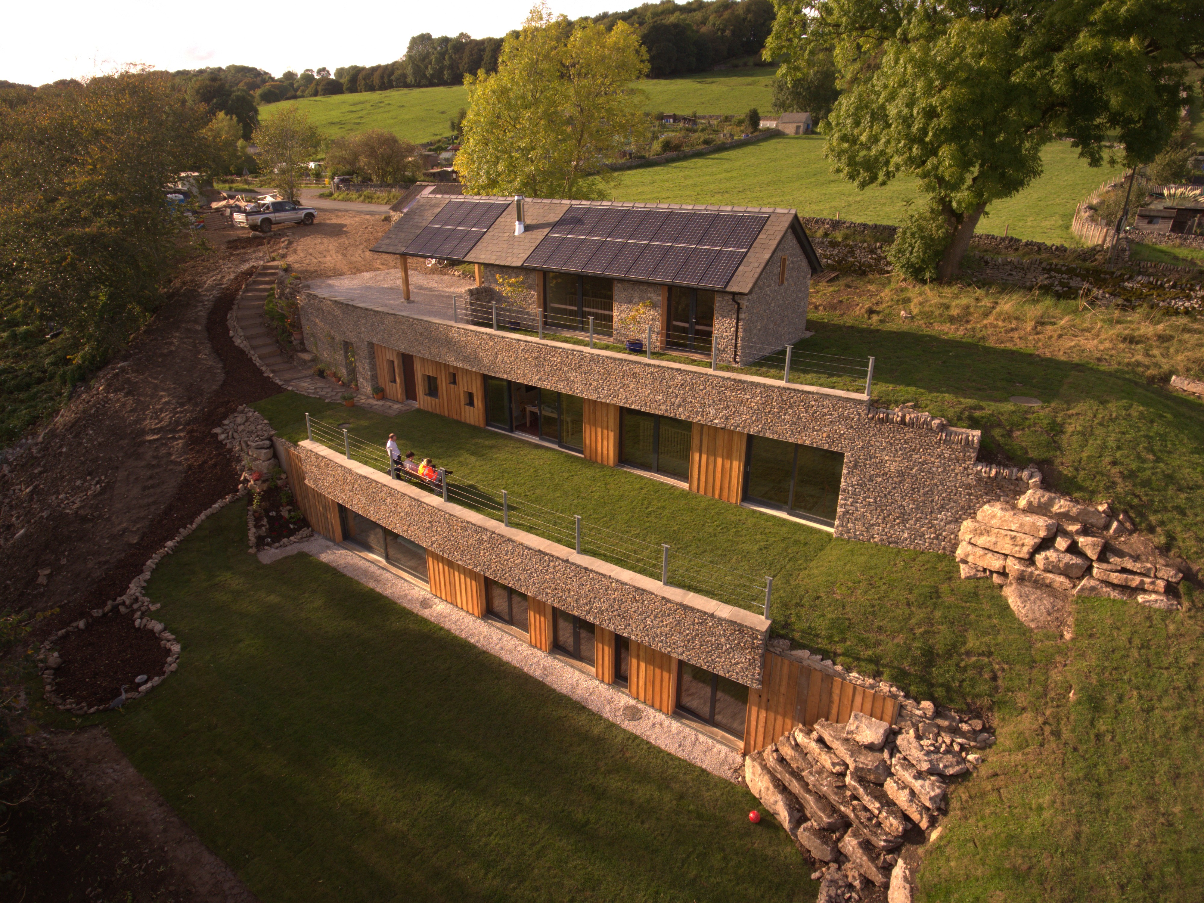 The Subterranean Eco House is underpinned by a thorough sustainable design strategy. Heating is achieved through passive solar gain, removing the need for a traditional central heating system. Exposed thermal mass captures heat during the day and releases it gradually overnight, while a whole house mechanical ventilation system ensures a constant supply of fresh air with minimal heat loss, supporting both comfort and long term energy efficiency. The materials are limestone rubble for most external walls, glazing and timber cladding for the south facing walls and polished concrete floors.